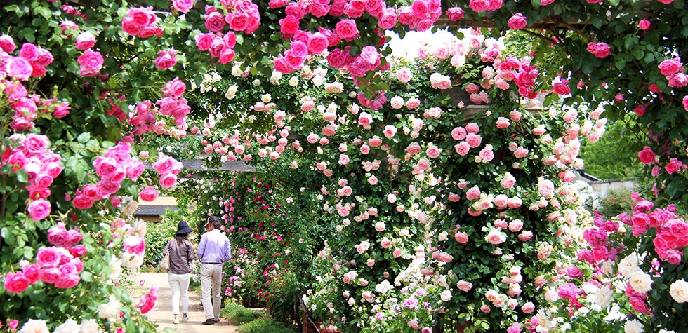 初夏にはバラまつりが開催され、まちがバラ色に染まります。