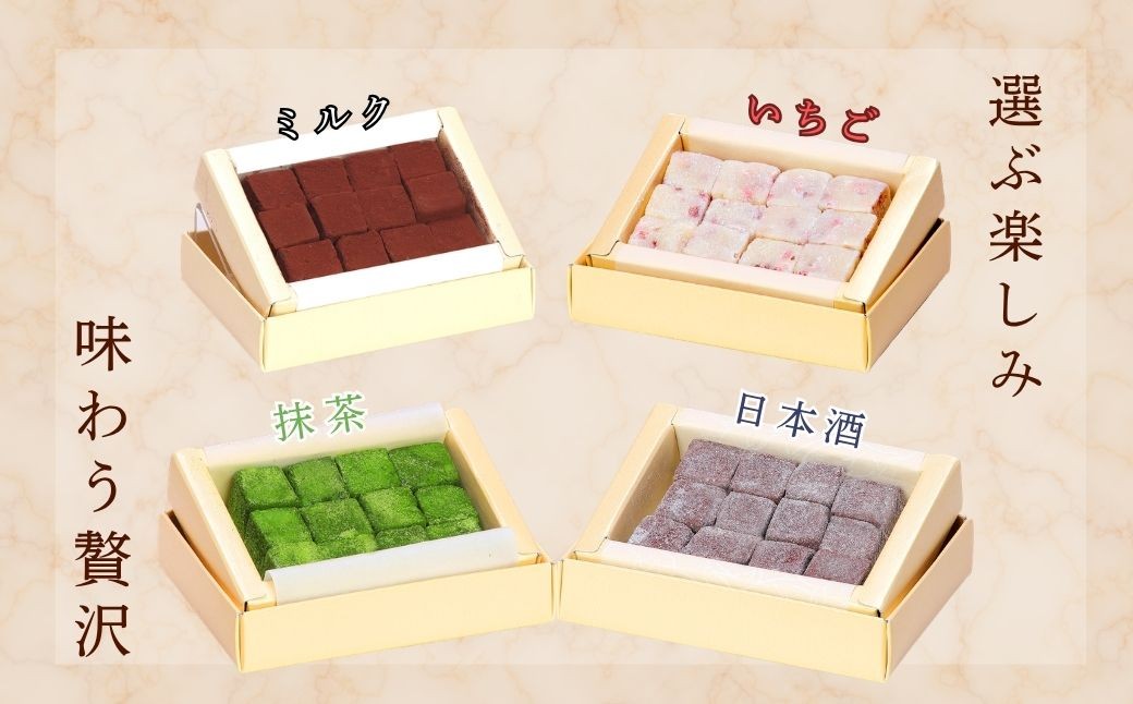 | 容量 | ▼生チョコ4箱セット ・12粒入り(1箱)×4箱 ・種類:ミルク・いちご・抹茶・日本酒 |