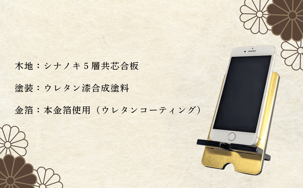 | 容量 | スマートフォンスタンド【黒漆】 木地:シナノキ5層共芯合板 塗装:ウレタン漆合成塗料 金箔:本金箔使用(ウレタンコーティング) |