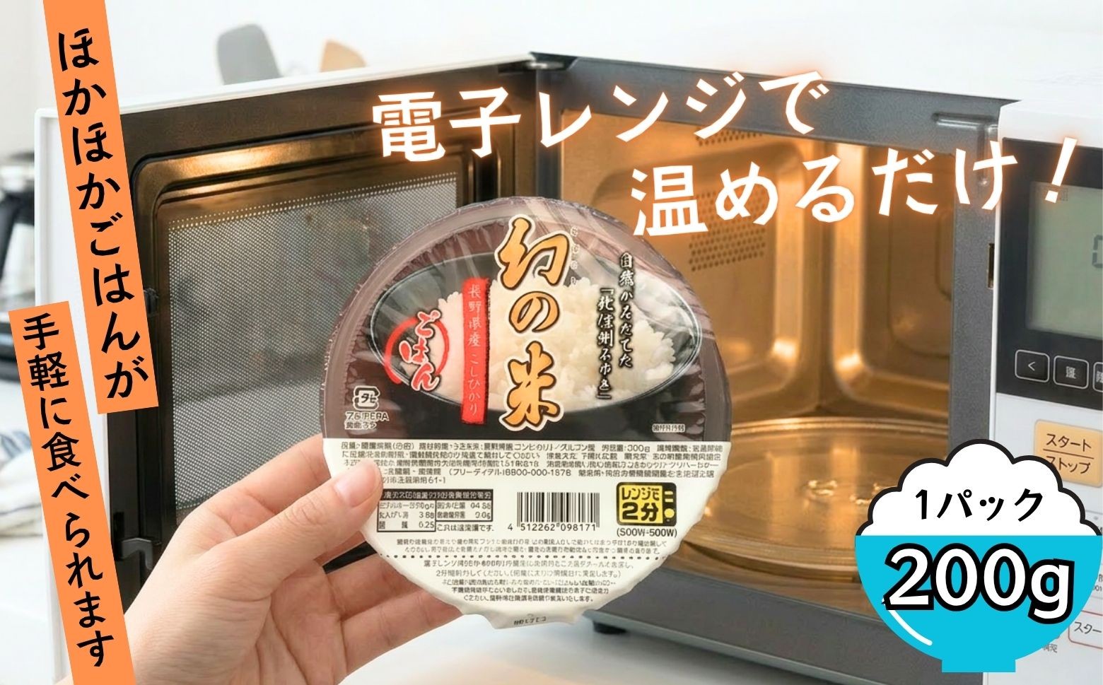 ご飯を炊くのが面倒なとき、忙しくて時間がなかったり、ご飯が少し足りない時など、手軽にレンジで2分温めていただくだけでお召し上がりいただけます。