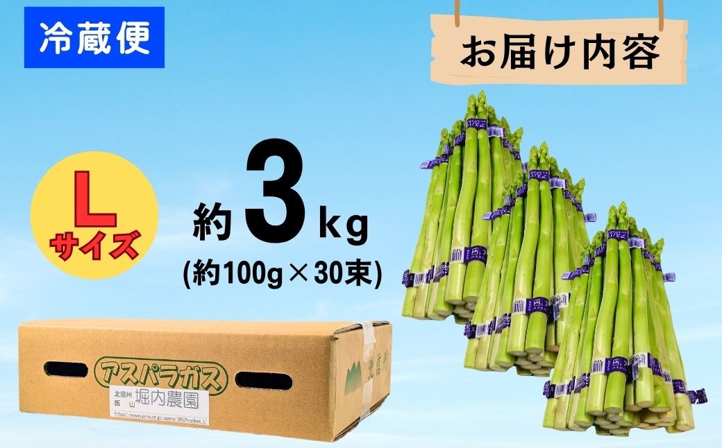 | 容量 | 飯山産アスパラガス サイズ:L級 重さ:約3kg(1束<3〜6本/100g>×30束) |