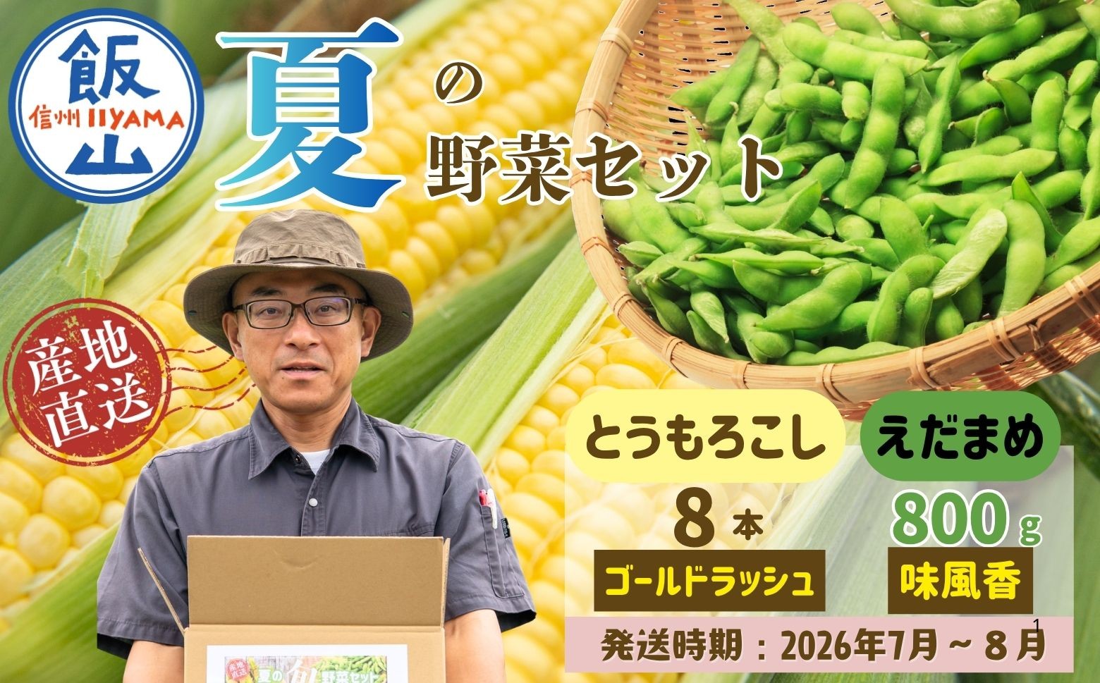 | 容量 | ・トウモロコシ(品種:ゴールドラッシュ) 8本 ・枝豆(品種:味風香) 800g(400g×2袋) |