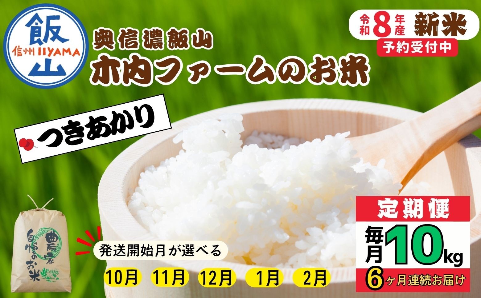 豪雪の地で育まれた農家自慢の「つきあかり」を定期便で! 【令和8年新米予約】《定期便》\配送開始月が選べる / 10kg×6回 合計 60kg 奥信濃飯山~木内ファームのお米~ つきあかり|長野県 飯山市 新米 お米 米 コメ ごはん 白米 ツキアカリ 定期便 10kg 60kg 6回 おいしい オススメ(Ca-070)