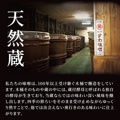 八ヶ岳山麓から地下を通り木落し下より湧き出ている名水、昔から手造り蔵に居ついた醸造菌、檜の大樽、職人の伝統の技によって生まれる信州味噌個性溢れる「丸井伊藤商店だけの味」です。