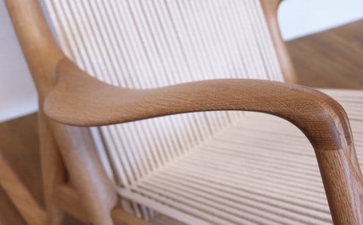 厚い国産ナラ材を削り出して作ったアームが特徴のロッキングチェア。