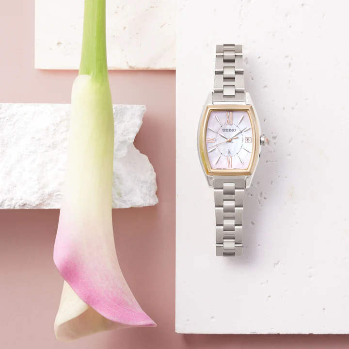 みずみずしく咲く芍薬をデザインモチーフに 自分らしく美しく開花していく女性を、みずみずしく咲く芍薬に重ね合わせて表現しました。 トノー型モデルは、みずみずしく咲く芍薬の優しいカラーリングを取り入れたデザインです。 ダイヤルには、花びらのようなカーブがかった放射状の繊細な型打ち模様を採用。さりげない光の陰影が感じられる、高級感のある仕上げになっています。インデックスは、伸びやかなローマ数字で、まっすぐに咲く花の佇まいを表しています。 花が開く様子をイメージしたりゅうずには、淡いピンク色のクリスタルガラスをあしらいました。 ※アフターサービスのため、販売店にて、保証書にお客様情報を登録させていただきます。 ※バンド調整は東京のお客様相談室ご来室窓口で初回のみ無料でご対応いたしますが、ご近所の時計店様では有料調整となります。あらかじめご了承ください(上記スペック欄に記載されている腕周り長さ(最長)より長くする場合には別途料金が必要となります)。 長野県塩尻市は、県内製造品出荷額1位を誇る"ものづくり"のまちです。市内に立地するセイコーエプソン株式会社から生み出された、最先端の技術が詰まった製品をお届けします。 熟練の匠が心を込めて一つひとつ組み立てた時計は、美しく、正確に時を刻みます。