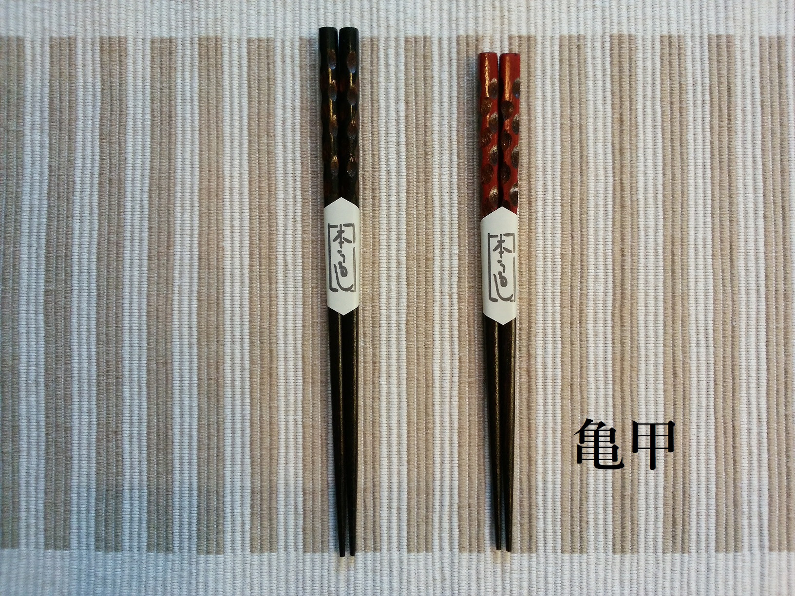 その部分を亀甲と呼んでいます。先端は特別な加工はしておりませんが、スリ漆だけなので麺などを摘まんでも滑りにくくなっております。赤、黒のペアで箱入りとなっております。