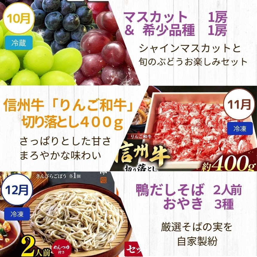 | 容量 | 1月:ピッツァMサイズ5枚セット 2月:骨なし鶏肉1枚(目安300g)2枚、鶏もつ煮250g 2袋 3月:信州産はちみつ( 百花信州 )180g 4月:マカロン15個 5月:マドレーヌミエル4個、マドレーヌシトロン4個 6月:赤玉・青玉ランダム 10個×2パック 7月:信州たのめの里の水(ラベルレス)2L×6本 8月:信州そば 200g×2個、生わさび 2個(めんつゆ 30g×2個、おろし金 1個) 9月:プレミアムジュースメルロー、シャルドネ 500ml 各1本 10月:シャインマスカット1房と希少品種からいずれか1房(おまかせ) 11月:りんご和牛信州牛 切り落とし 約400g 12月:鴨だしそば 200g×2個(めんつゆ 25g×2個)、おやき(野沢菜、切干大根、きんぴらごぼう 各1個) |