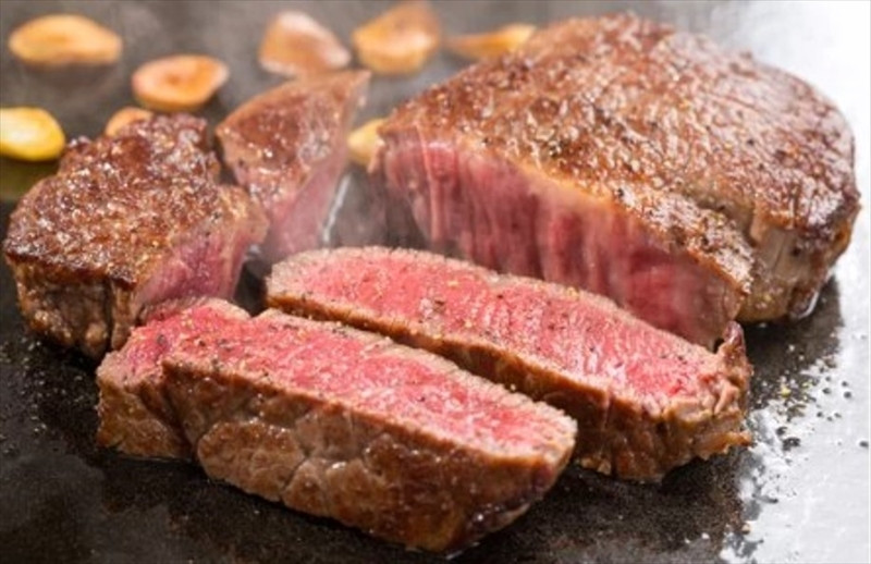 こちらのステーキはお刺身感覚でタタキ風にして刻みわさびとお刺身しょうゆ、岩塩などでお召し上がりください。