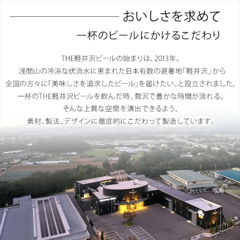 THE軽井沢ビールの始まりは、2013年。浅間山の冷涼な伏流水に恵まれた日本有数の避暑地「軽井沢」から全国の方々に「美味しさを追求したビール」を届けたい。と設立されました。一杯のTHE軽井沢ビールを飲んだ時、贅沢で豊かな時間が流れる。そんな上質な空間を演出できるよう、素材、製法、デザインに徹底的にこだわって製造しています。