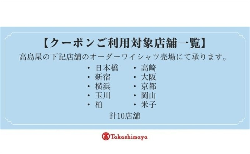 高島屋の対象店舗にてお取り扱いするオーダーワイシャツのうち、長野県佐久市所在の指定工場縫製品にご利用いただけます。
