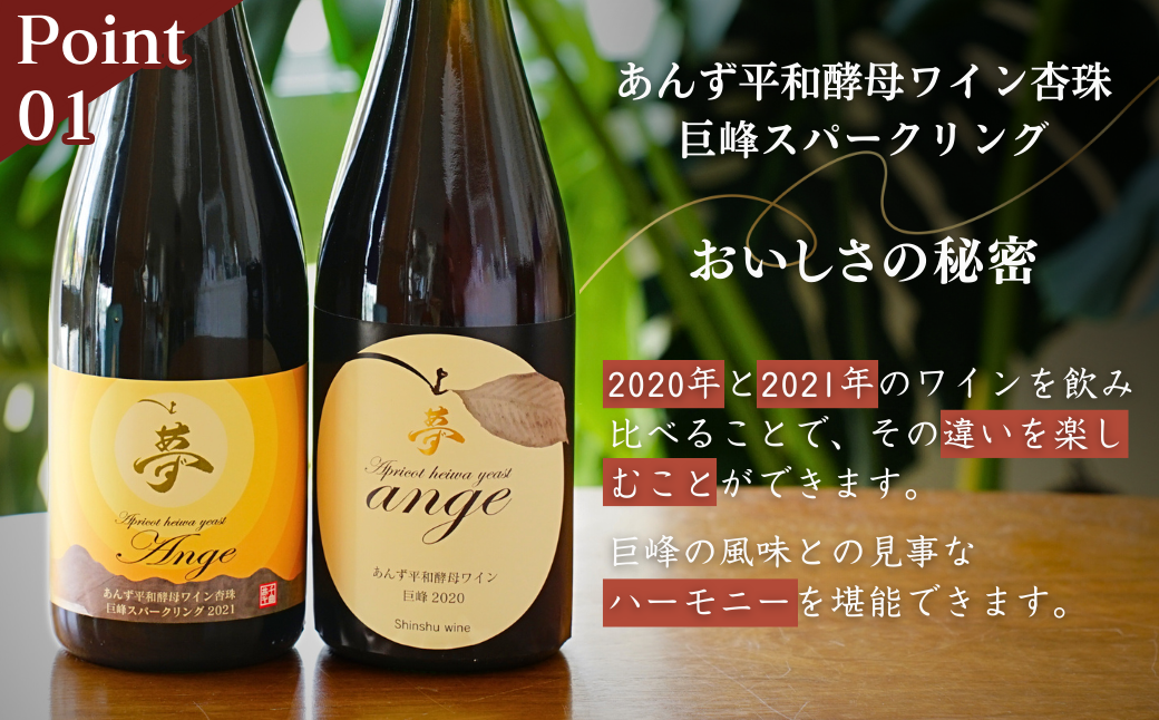 あんず平和酵母は、平和という品種の杏の実から見つかった珍しい酵母です。酵母が生きているため、時間とともに味わいが変化します。2020年と2021年のワインを飲み比べることで、その違いを楽しむことができ、巨峰の風味と見事なハーモニーを堪能できます。