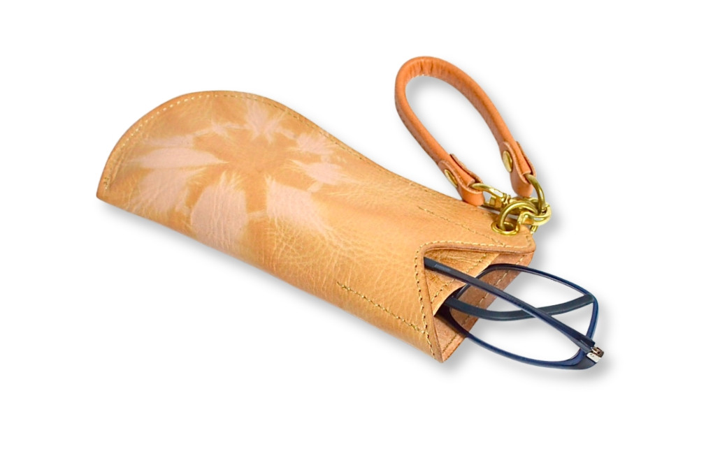このメガネケースは、信州鹿革をベースにした、あんず染革版の特別なアイテムです。さらに、バッグにぶら下げて持ち歩けるループとナスカンが付いており、メガネの取り出しも簡単です。メガネを固定し、傷や落下から守ることができます。