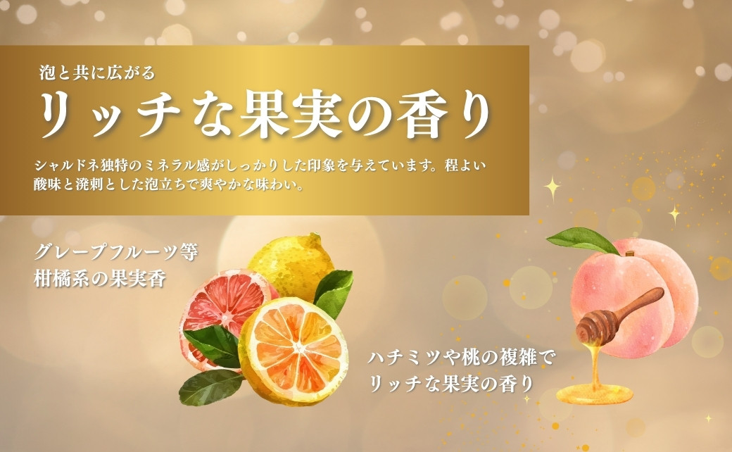 グレープフルーツ等柑橘系の果実香にハチミツや桃の複雑でリッチな果実の香りが泡と共に広がります。