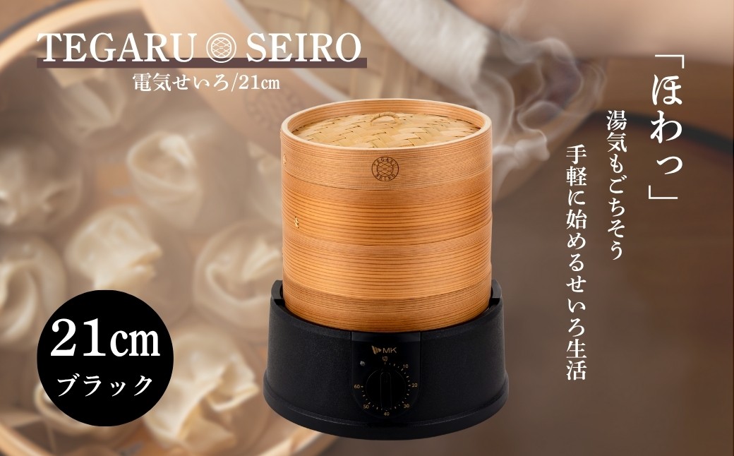 ほったらかし料理ができるコンパクトサイズの電気せいろ 電気せいろ「TEGARU SEIRO」21cmタイプ/ブラック(EM-215K)|簡単 セイロ せいろ 蒸籠 タイマー付き 家 おうち お家 本格 本格せいろ 蒸し器 家電 電気 調理家電 キッチン家電 蒸し料理 エムケー精工 信州 長野県 千曲市
