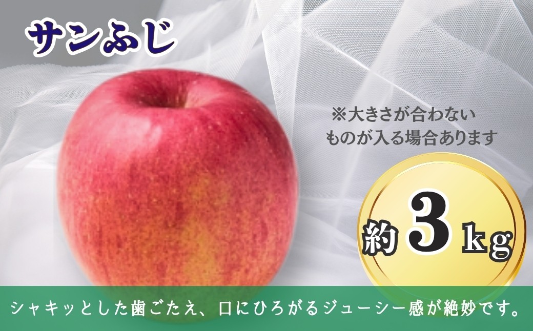 「サン」とは「太陽(sun)」のことで、袋をかけないで栽培する「無袋りんご」で日光を充分に浴びるため糖度が増したふじりんごです。