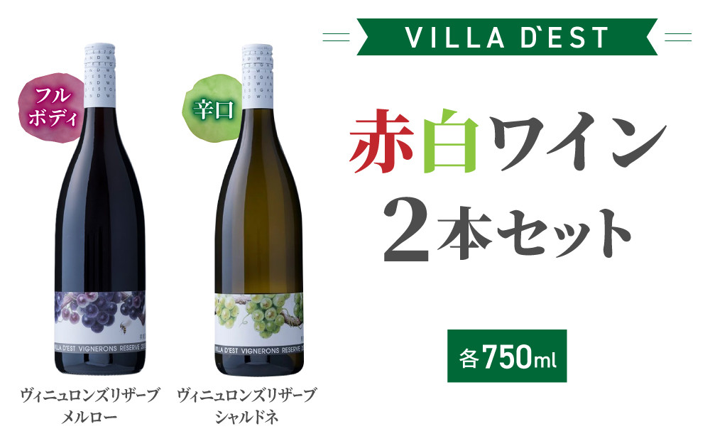 サミット等でも提供されたヴィラデストを代表する白ワイン「ヴィニュロンズリザーブ シャルドネ」と、しっかりとした味わいに、柔らかさと深みを併せ持つ赤ワイン「ヴィニュロンズリザーブメルロー」をセットにしました。