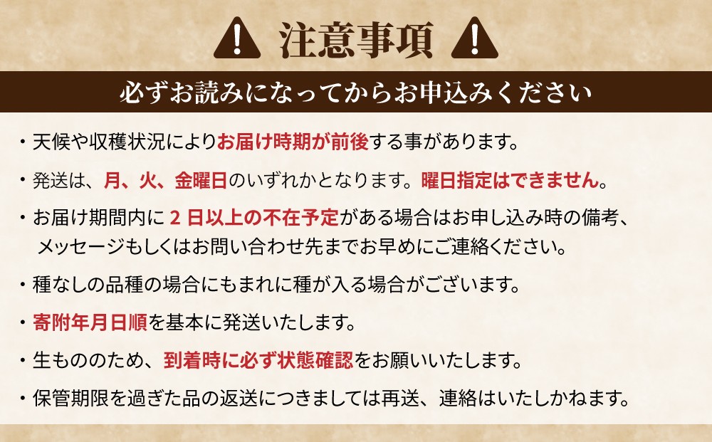 ※発送開始時期は、天候により数週間程度遅れる場合がございます。美味しくお召し上がり頂けます適期にお届けさせて頂きたく存じますので、ご了承の程、宜しくお願い申し上げます。