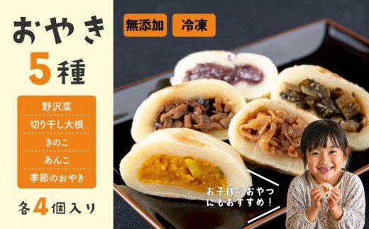おやき5種 20個セット(野沢菜、切り干し大根、きのこ、あんこ…