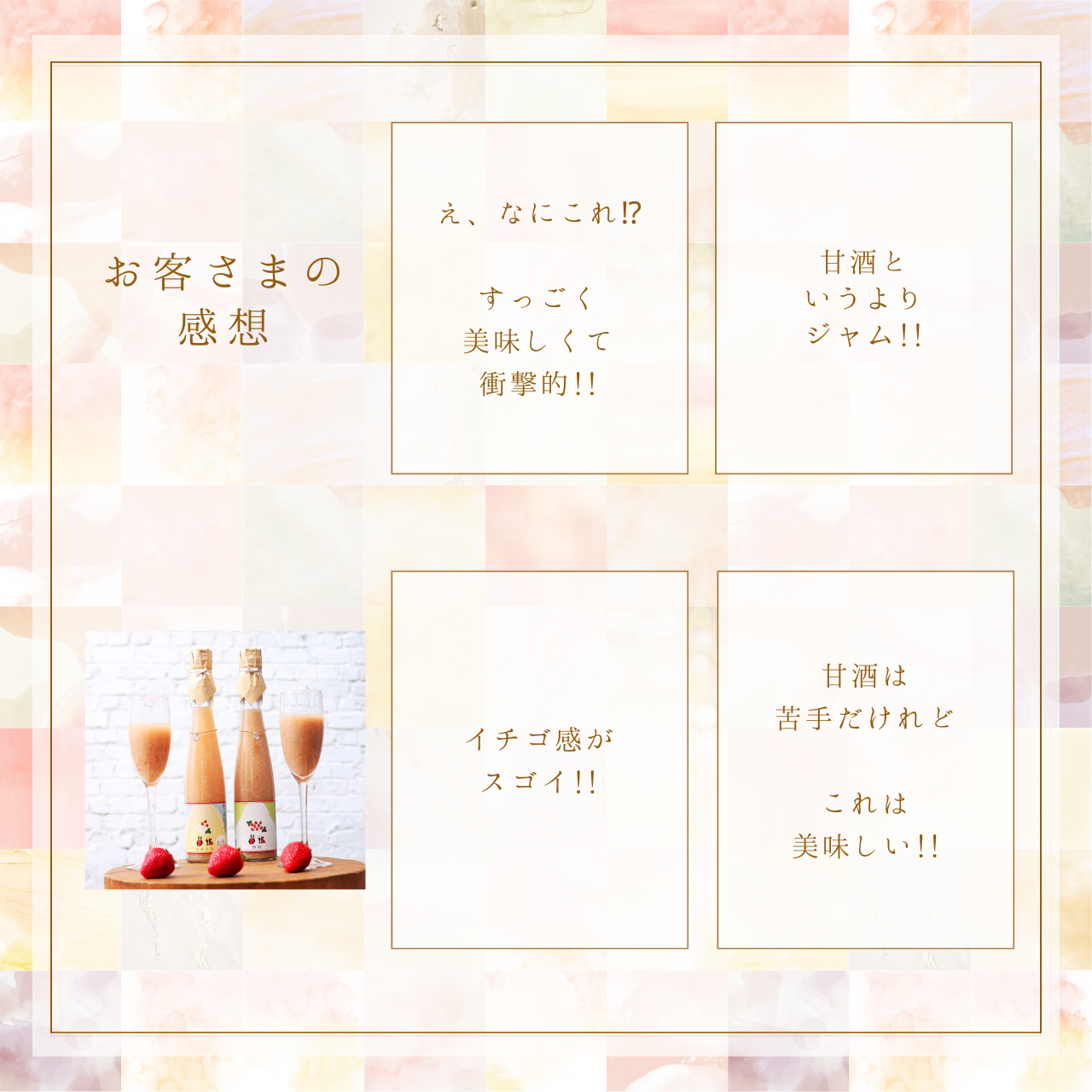 農園と酒蔵の強みを活かして、イチゴと甘酒を最大限の濃度でブレンドしました。