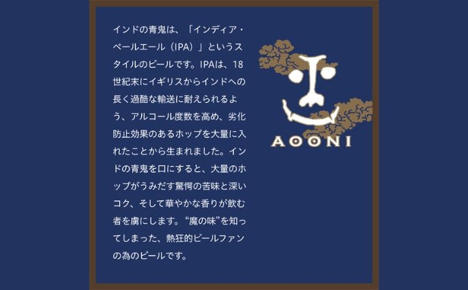 インドの青鬼は、「インディア・ペールエール(IPA)」というスタイルのビールです。IPAは、18世紀末にイギリスからインドへの長く過酷な輸送に耐えられるよう、アルコール度数を高め、劣化防止効果のあるホップを大量に入れたことから生まれました。インドの青鬼を口にすると、大量のホップがうみだす驚愕の苦味と深いコク、そして華やかな香りが飲む者を虜にします。“魔の味”を知ってしまった、熱狂的ビールファンの為のビールです。美しい琥珀の色合いとエールビールの特徴である香りを楽しむため、飲み口の広いグラスでお飲みください。喉ごし命のビールと違い、エールビールは香りとコクが命。インドの青鬼の香りが引き立つ温度は、少しぬるめの13℃です。通常のキンキンは5℃くらいのですので、ちょっと冷たいと感じるくらいがおいしい温度です。ヤッホーブルーイングはファンの皆様に支えられて20年以上長野県でクラフトビールをつくり続けています。国内外のさまざまな賞を受賞した「世界品質のクラフトビールをめざして磨いた技術」を、惜しみなくそそいでつくられるクラフトビールをどうぞお楽しみください。