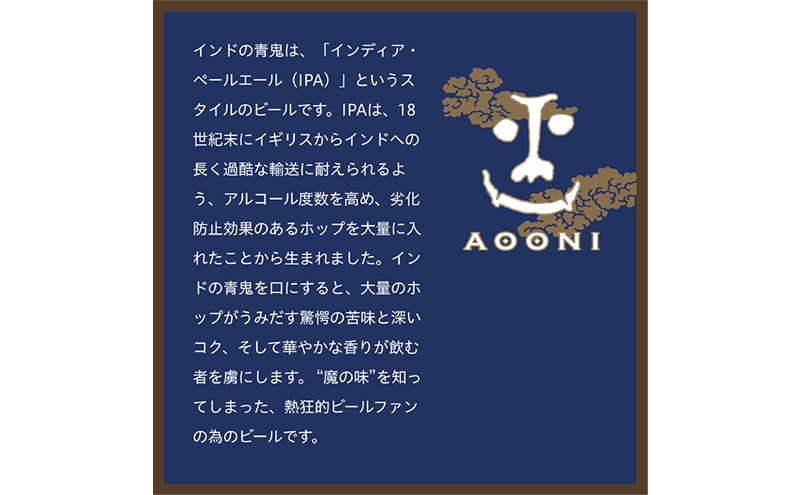 インドの青鬼は、「インディア・ペールエール(IPA)」というスタイルのビールです。インドの青鬼を口にすると、大量のホップがうみだす驚愕の苦味と深いコク、そして華やかな香りが飲む者を虜にします。“魔の味”を知ってしまった、熱狂的ビールファンの為のビールです。