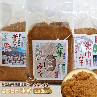 | 容量 | ■内容量/原産地 ・昔ながら味噌 (1kg / 御代田産) ・発芽玄米味噌 (1kg / 御代田産) ・きび入り味噌 (兎巾) (1kg / 御代田産) ■原材料 ・昔ながら味噌:米味噌、大豆(御代田産・佐久産)、米(御代田産)、食塩 ・発芽玄米味噌:米味噌、大豆(御代田産・佐久産)、米(御代田産)、発芽玄米(御代田産) ・きび入り味噌(兎巾):米味噌、大豆(御代田産・佐久産)、米(御代田産)、きび(御代田産)、食塩 |