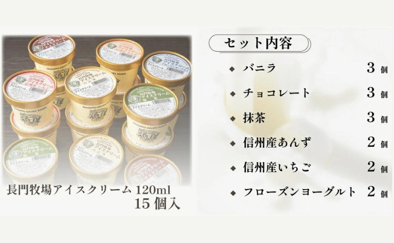 | 容量 | 内容量:長門牧場アイスクリーム120㎖ バニラ3個、チョコレート3個、抹茶3個 フローズンヨーグルト2個、信州産いちご2個、信州産あんず2個 |