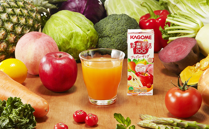 「野菜生活100」アップルサラダは、20種類の野菜と6種類の果実を使用した野菜果実ミックスジュースです。