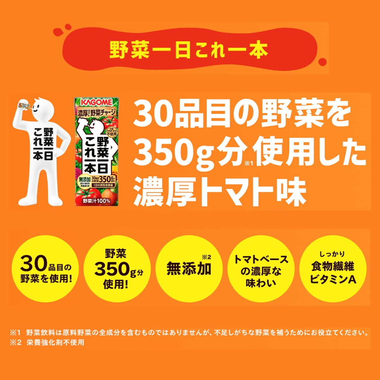 「野菜一日これ一本」は、「これ一本」で彩り豊かな30品目の野菜を350g分使用し、香料や栄養強化剤を使用せずに、野菜由来の栄養(※1)とおいしさを提供する無添加の野菜100%ミックスジュースです。