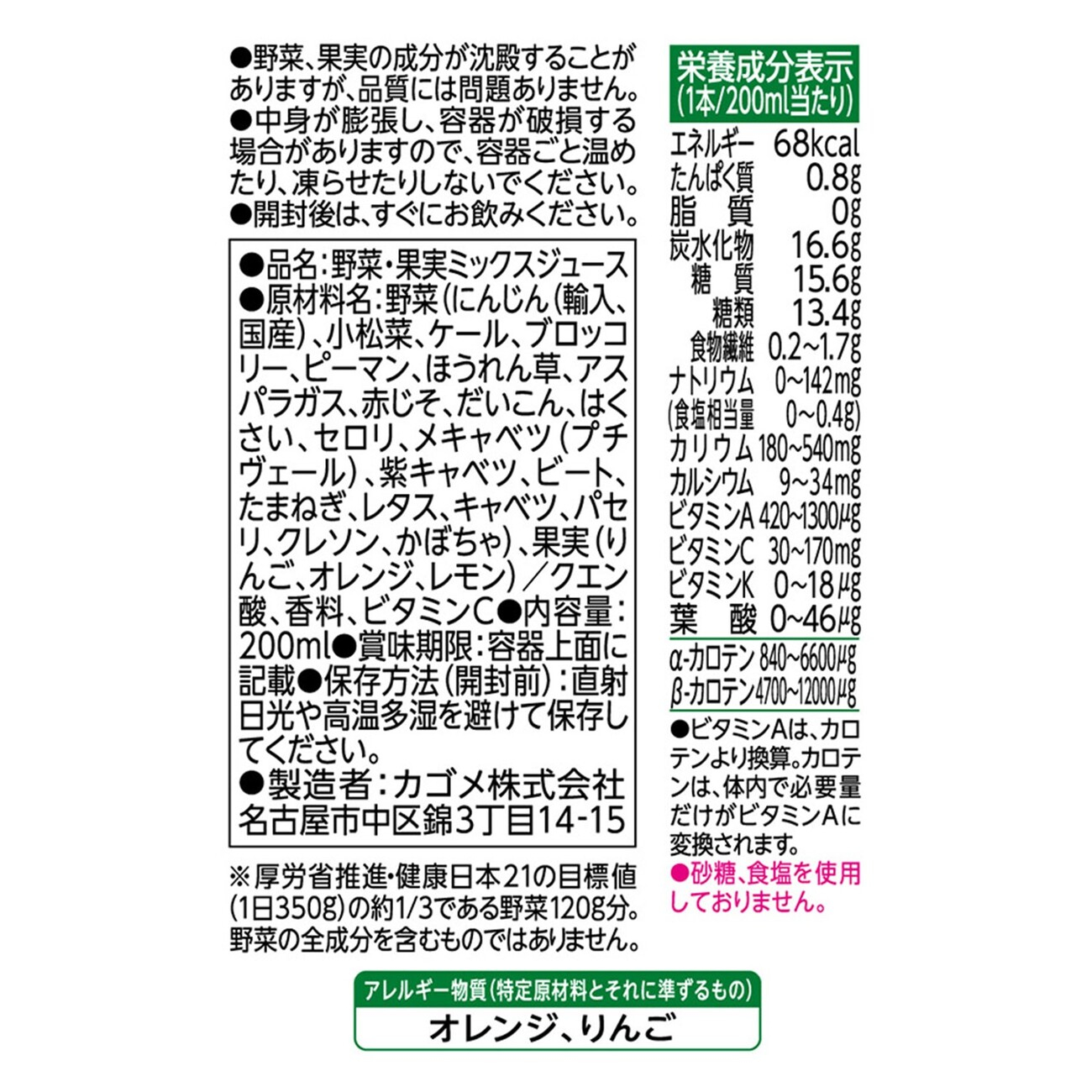 1食分(※1)の野菜を使用し、オレンジやりんごのフルーティーな味わいを楽しみながらビタミンAとビタミンCがたっぷり摂れるので、家族みんながおいしく手軽に野菜を補える野菜飲料です。