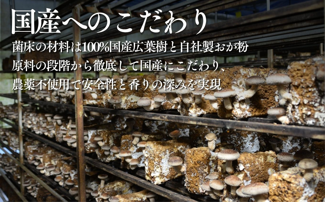 100%国産広葉樹のおが粉からつくる自家製菌床に、芽かきや水管理まで全て手作業。ひとつひとつに心を込めて育てた椎茸は、肉厚でジューシィ。脇役なんて言わせない、料理の主役になれる椎茸を目指して、今日も手を抜かず向き合っています。