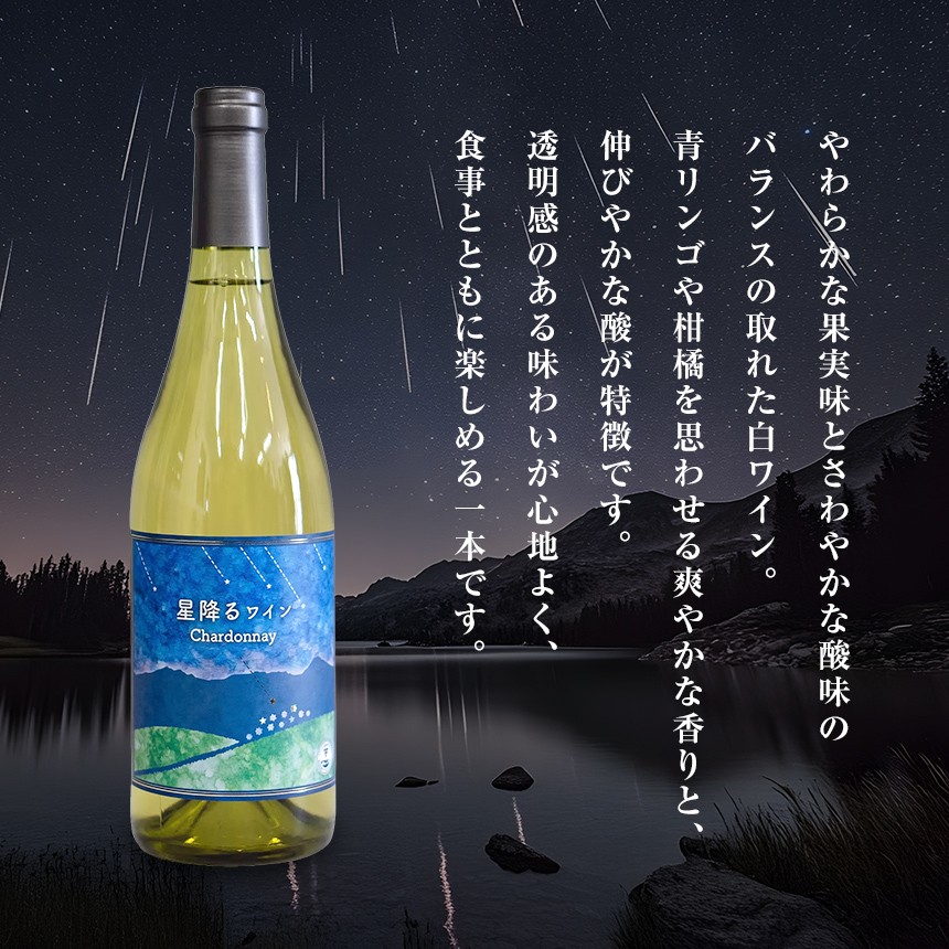 | 容量 | 星降るワインChardonnay 750ml 1本(化粧箱入り) ぶどう産地:長野県産 原材料:ぶどう、酸化防止剤 (アルコール度数12%) |