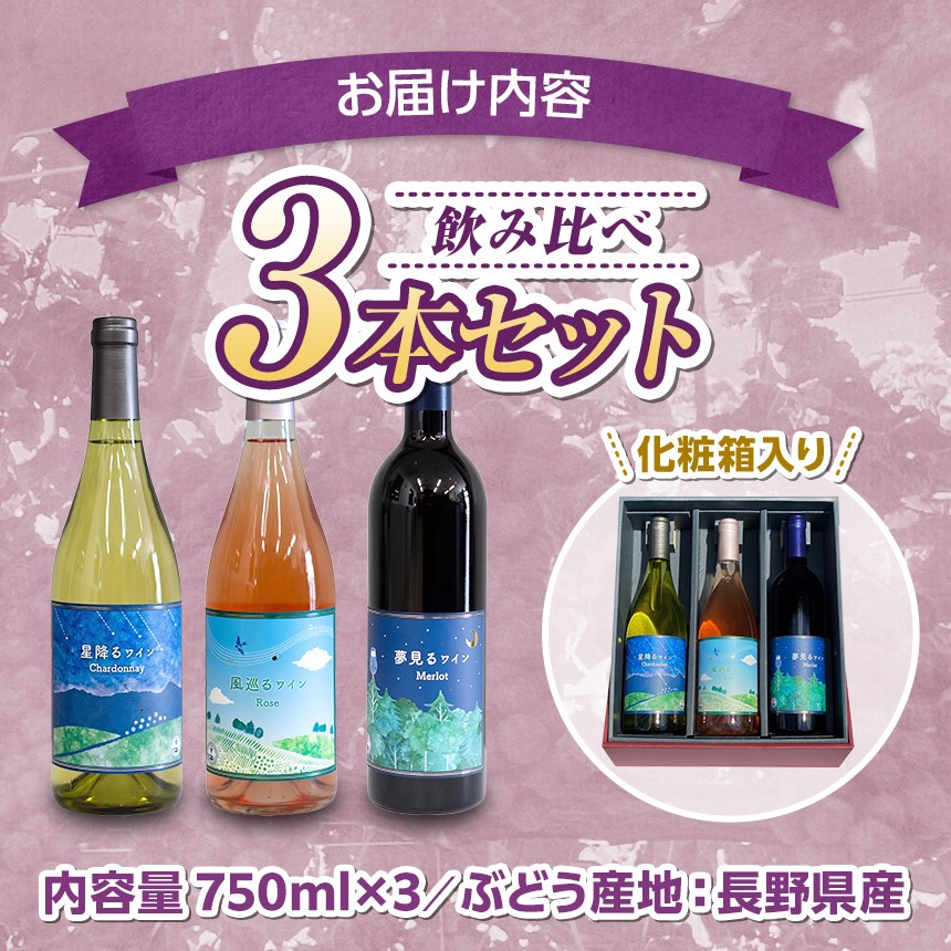 星降るワインChardonnayと風巡るワインRoseと夢見るワインMerlotの飲み比べセットです。