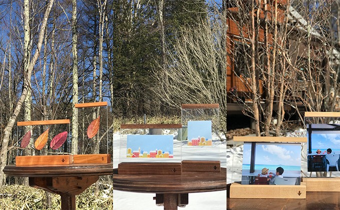 上下の木材をアクリル板からはずして、2枚のアクリル板の間に 0.3mm以内のお気に入りの写真やイラスト・木の葉・押し花・布・等々 挟んでインテリアをお楽しみください。