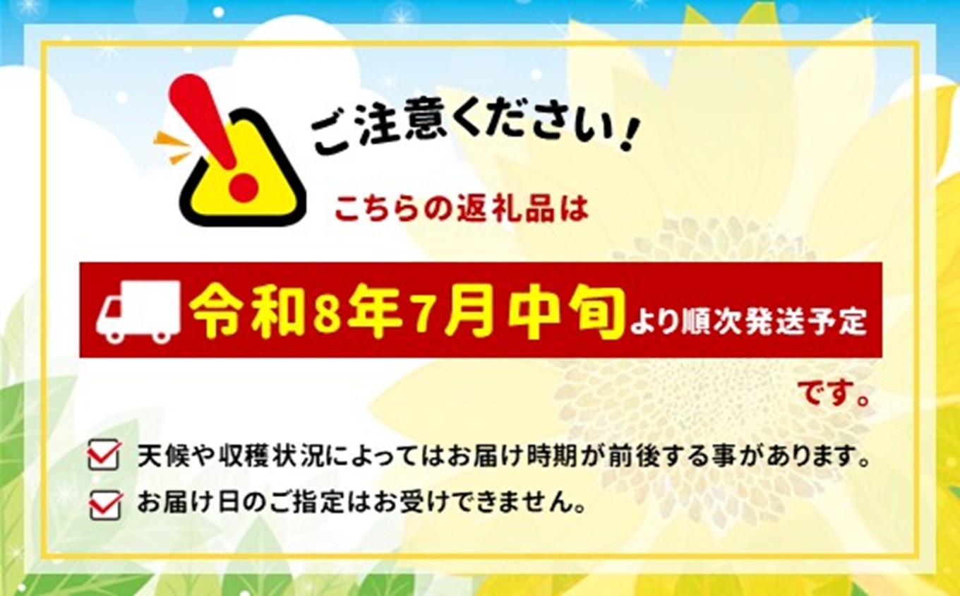 2026年7月中旬~9月下旬の間に順次発送いたします。 (発送日・到着予定日等のご案内はしておりません) 【発送について】 ※農作物のため天候や育成状況によっては発送予定から前後する場合がございます。 ※お届け日の指定はできませんので、ご了承ください。 ※長期不在のご予定があれば事務局へご連絡ください。 ※尚、長期不在等によりお礼の品をお受取りできなかった場合、再発送はできません。あらかじめご了承ください。 ※配送業者はヤマト運輸となります。 ※返礼品の配送先住所に変更があった場合には、速やかに事務局までご連絡ください。 ※発送後の場合は、直接、配送業者にお問い合わせください。 ※転送料金がかかる場合は寄附者様のご負担となります。 |