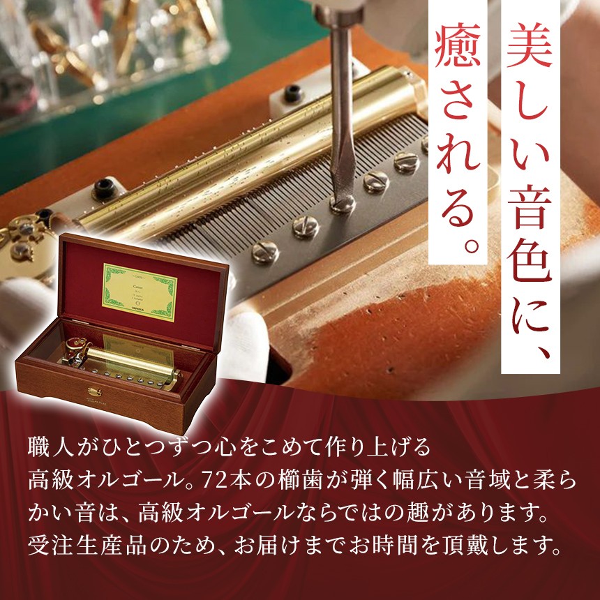 職人がひとつずつ心をこめて作り上げる高級オルゴール。72本の櫛歯が弾く幅広い音域と柔らかい音は、高級オルゴールならではの趣があります。