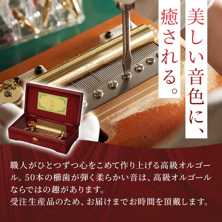職人がひとつずつ心をこめて作り上げる高級オルゴール。50本の櫛歯が弾く柔らかい音は、高級オルゴールならではの趣があります。