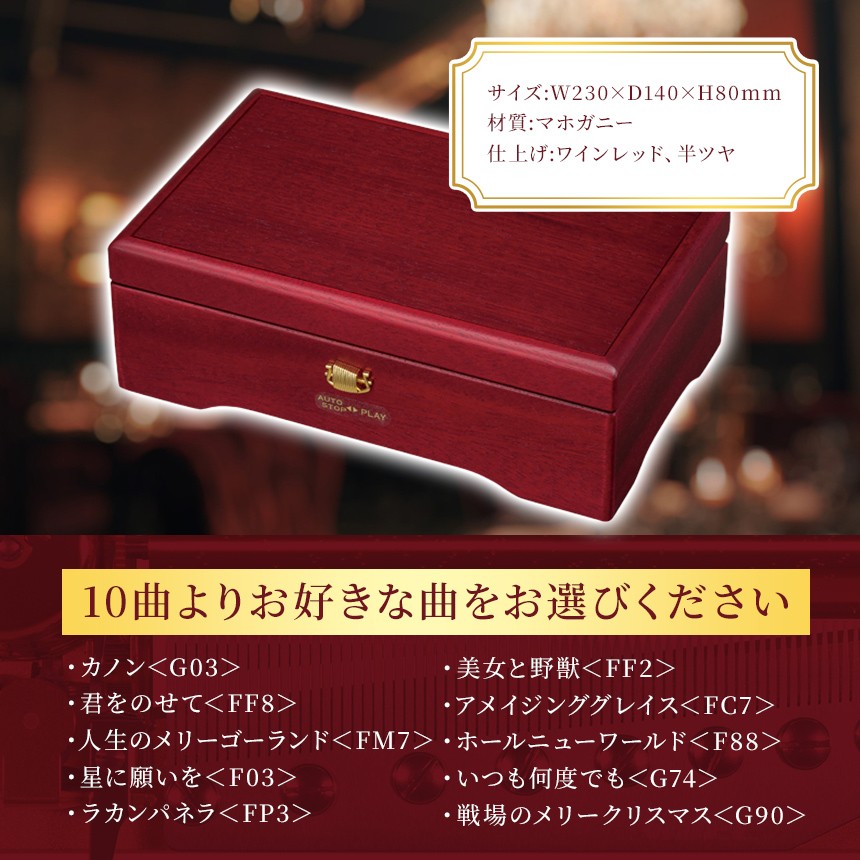 | 容量 | 本体サイズ:W230×D140×H80mm 材質:マホガニー 仕上げ:ワインレッド、半ツヤ ※10曲よりお好きな曲をお選びください ・カノン<G03> ・君をのせて<FF8> ・人生のメリーゴーランド<FM7> ・星に願いを<F03> ・ラカンパネラ<FP3> ・美女と野獣<FF2> ・アメイジンググレイス<FC7> ・ホールニューワールド<F88> ・いつも何度でも<G74> ・戦場のメリークリスマス<G90> |