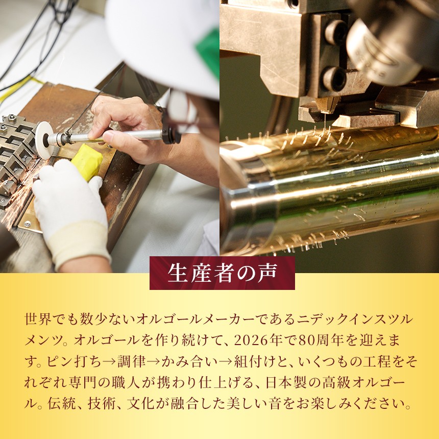 世界でも数少ないオルゴールメーカーであるニデックインスツルメンツ。オルゴールを作り続けて、2026年で80周年を迎えます。ピン打ち→調律→かみ合い→組付けと、いくつもの工程をそれぞれ専門の職人が携わり仕上げる、日本製の高級オルゴール。伝統、技術、文化が融合した美しい音をお楽しみください。