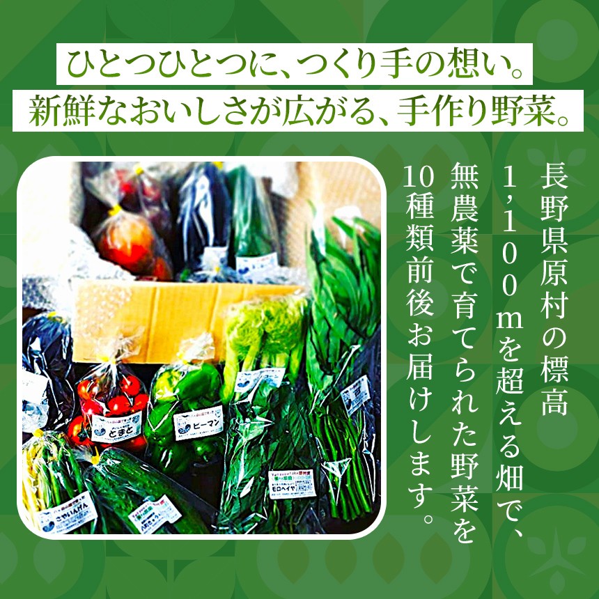 | 容量 | 無農薬で育てた旬の野菜を10種類前後(4~5人分) ※セット内容はおまかせください。 原産地:長野県原村 |