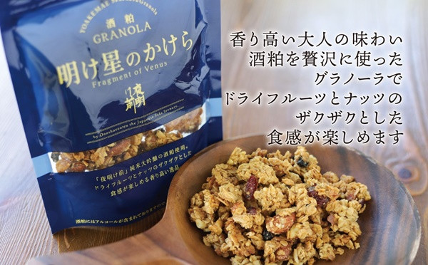 「夜明け前 純米大吟醸」の酒粕を使用した、ドライフルーツとナッツのザクザクとした食感と酒粕の優しい風味を味わえる、香り高いグラノーラ。