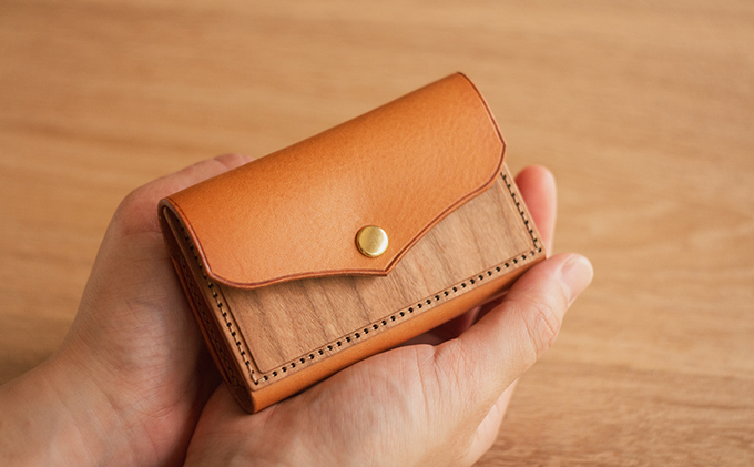 「木」と「革」を組み合わせて作られたカードケース。