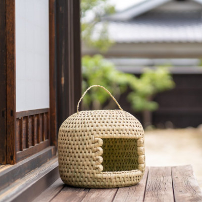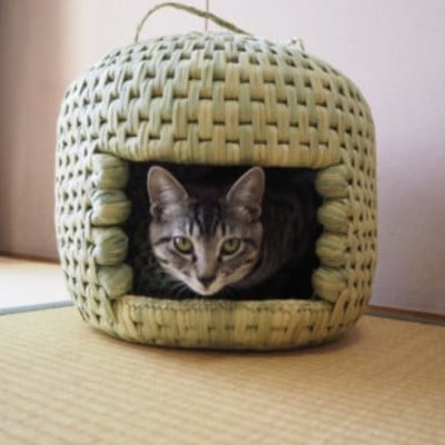 藁で作った猫の家です。大相撲の土俵に使用する白毛餅藁を使用し、猫の寿命と同じ20年使用できるよう職人が丁寧に製作しています。