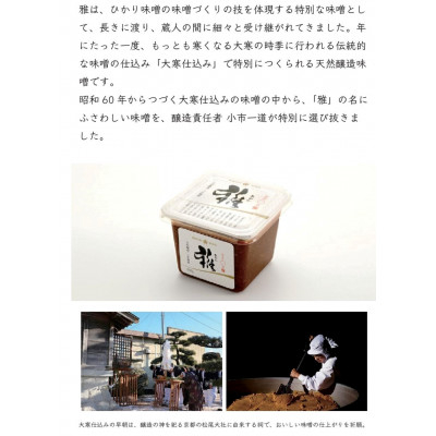 銀座KUKI特選 雅(みやび)は、年にたった一度、もっとも寒くなる大寒の時季に行われる伝統的な味噌の仕込み「大寒仕込み」で特別につくられる天然醸造味噌です。