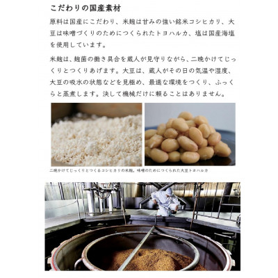 原料は国産にこだわり、米麹は甘みの強い銘米コシヒカリ、大豆は味噌づくりのためにつくられたトヨハルカ、塩は国産海塩を使用しています。