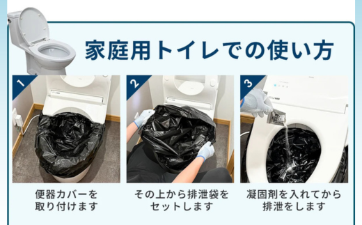 排泄後に凝固剤をふりかけるだけで、すぐにゼリー状に固まるため、水が使えない災害時や断水時でも安心して使用できます。