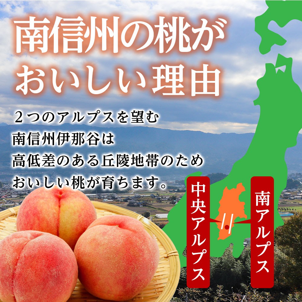 南信州は、温暖な天竜川沿いから冷涼な山麓にかけた一帯で、昼夜の寒暖差が大きいことから桃の糖度を上げ、とても甘い桃が実ります。また、水はけの良さと日照にも恵まれ、りんご、ぶどう、洋梨など他の果樹栽培にも適した地域です。