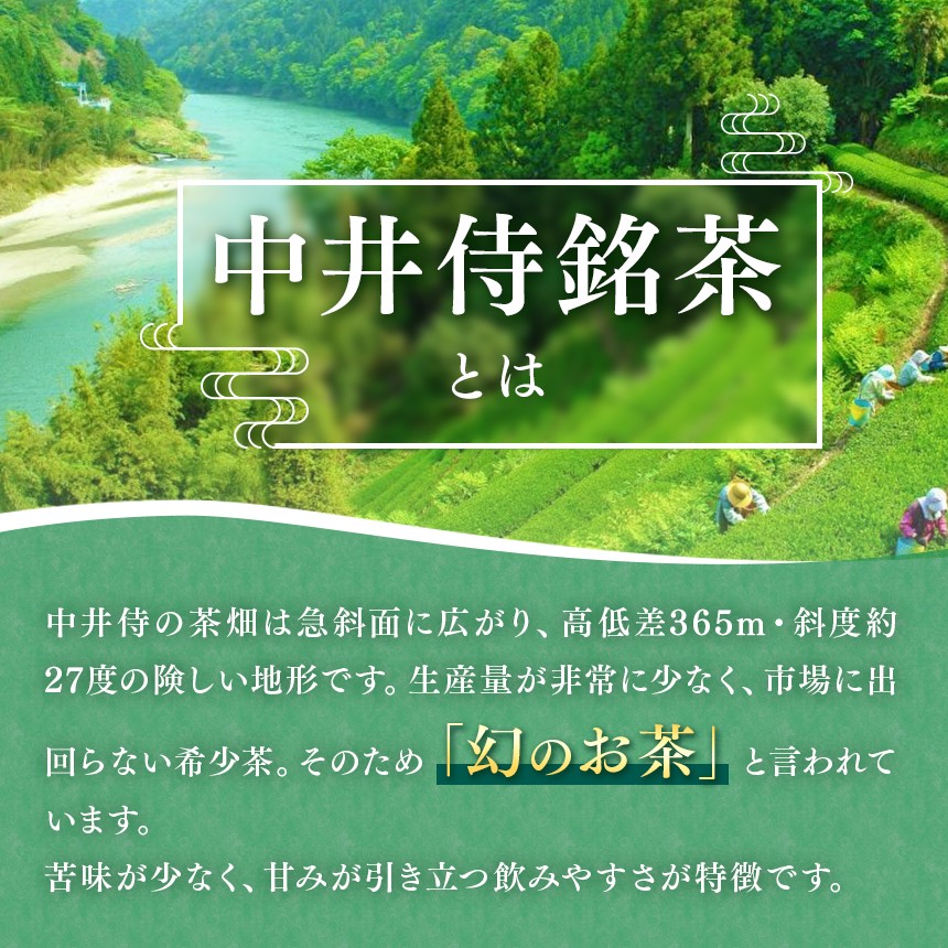 天龍村中井侍地区はお茶の生育に適した天竜川谷間の山間地に位置し長野県屈指のお茶の産地となっており、中井侍銘茶は希少価値の高さと品質の高さにより「幻のお茶」と呼ばれています。