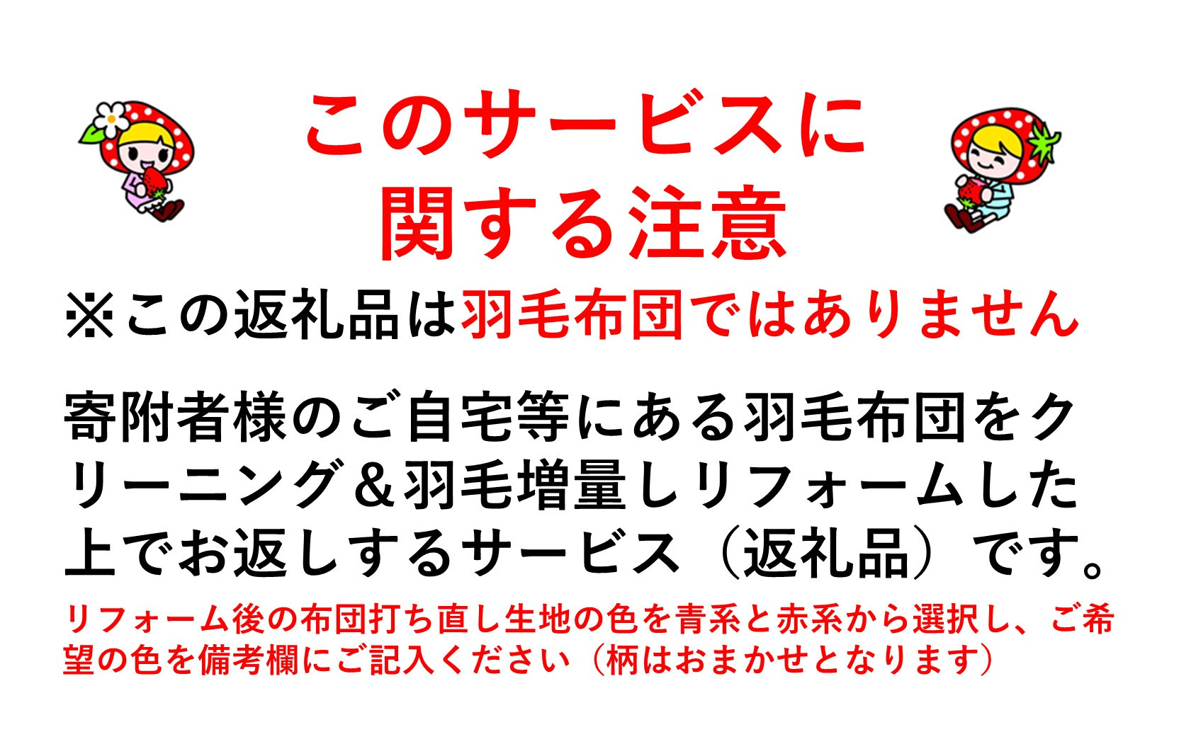 ・リフォーム後の布団の柄は青系、赤系のいずれかの柄となります。リフォーム前の柄は引き継がれませんのでご注意ください。